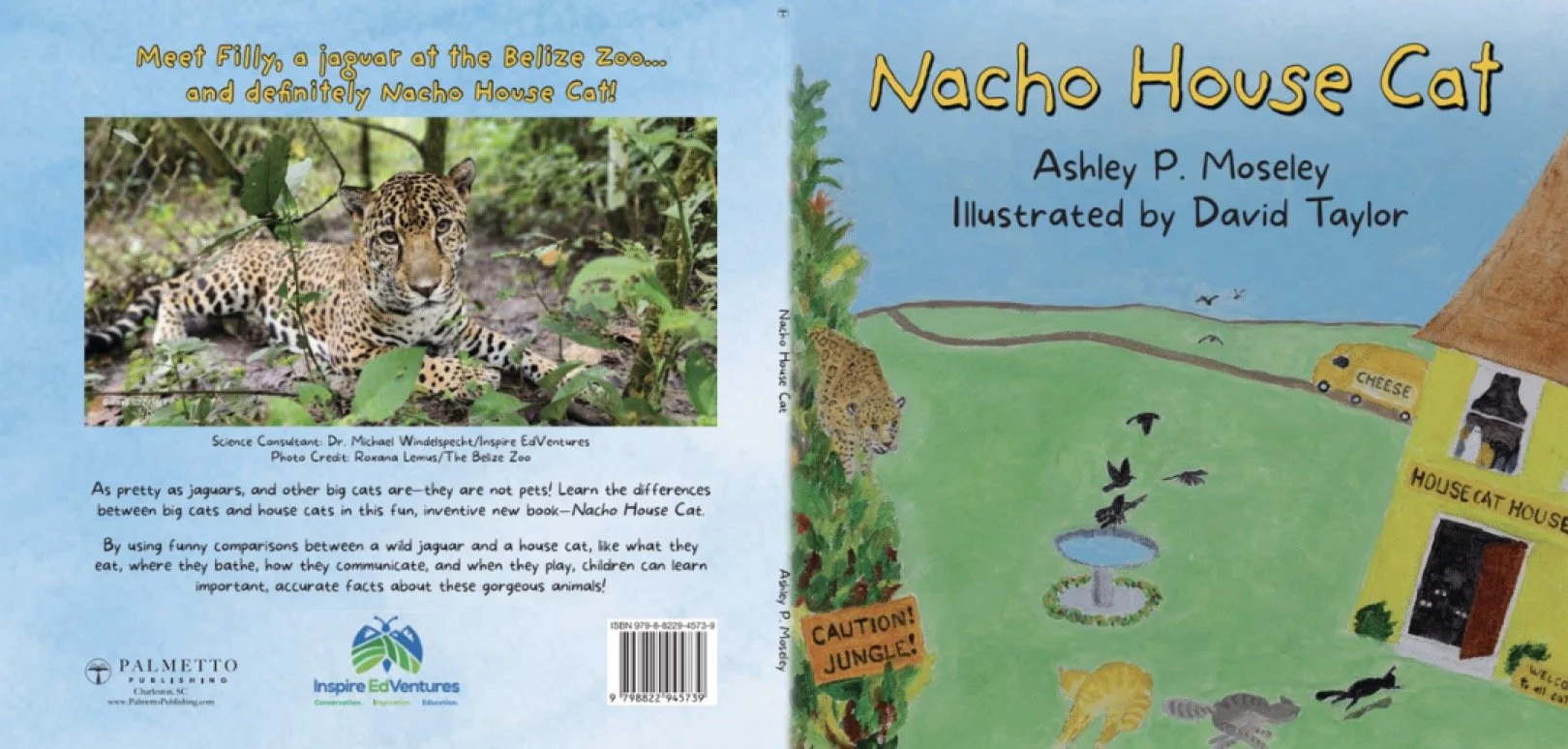 “Nacho House Cat was written to show (and give an element of humor) to the idea of having a jaguar as a house cat. I want to make learning fun and entertaining for kids. Additionally (and as you will see on the back cover), the jaguar that inspired this book, Filly, lives at The Belize Zoo. Filly is part of their Human Jaguar Conflict Program, which rescues “problem” jaguars. However, the conflict is rarely on the jaguar side, usually it is due to things like: habitat loss, unavailability of food, aging, and injuries. This program gives these amazing creatures a second chance at life, because they are very unique and impressive cats, but they are most definitely... Nacho House Cat!”